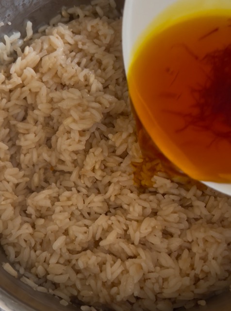 Quando mancheranno circa cinque minuti alla fine della cottura del riso, unite lo zafferano con il suo liquido di infusione. Se lo desiderate, potete conservare qualche pistillo da mettere a guarnizione del piatto.