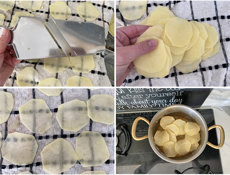 Fate scaldare abbondante olio di semi di arachidi in una pentola stretta dai bordi alti e, quando sarà ben caldo, mettete a cuocere le Chips di patate Per un paio di minuti fino a che diventeranno dorate poi scolatele su carta assorbente e salatele leggermente.