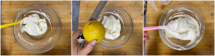 Quando avrete montato perfettamente la panna unitela delicatamente al resto della crema al mascarpone al limone con movimenti delicati dal basso verso l’alto e con una spatola in modo da non smontarla eccessivamente.