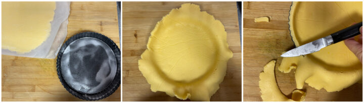 Tagliate i bordi di pasta frolla in eccesso con un coltello e teneteli da parte perchè vi serviranno per creare le griglie della crostata.
