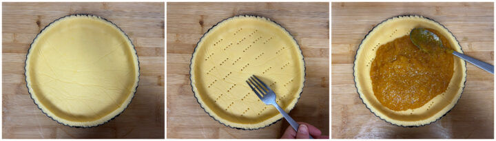 Quando avrete steso la pasta frolla imburrate uno stampo per crostate da 22 centimetri e mettete la base di pasta frolla con farina di riso.