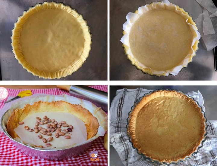 Bucherellate la base di pasta frolla con una forchetta, mettete un foglio di carta forno sopra e coprite con dei fagioli secchi o con un altro tegame (per capire meglio come fare LA COTTURA IN BIANCO LEGGETE QUI).