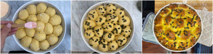 Spennellate tutta la superficie del panbrioche alla zucca ben lievitato con latte e uovo e aggiungete i semi di zucca.