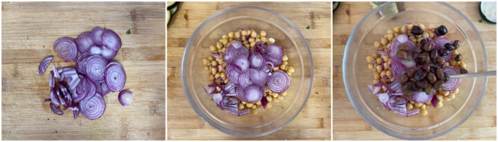 Aggiungete la cipolla rossa ai ceci nella ciotola.