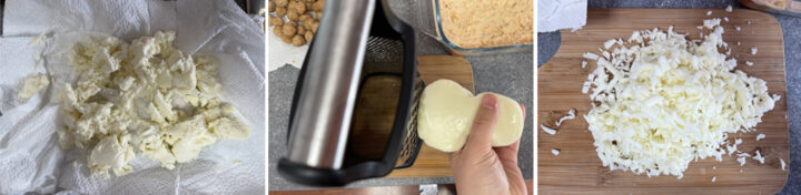 Sbriciolate con le mani la mozzarella e asciugatela molto bene dal siero con carta assorbente.