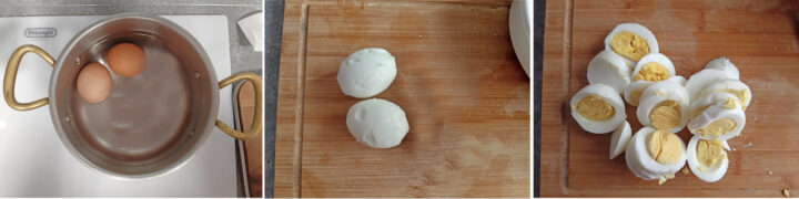 Mettete le uova in una pentola con acqua fredda e portate a bollore poi aspettate circa 8 minuti.