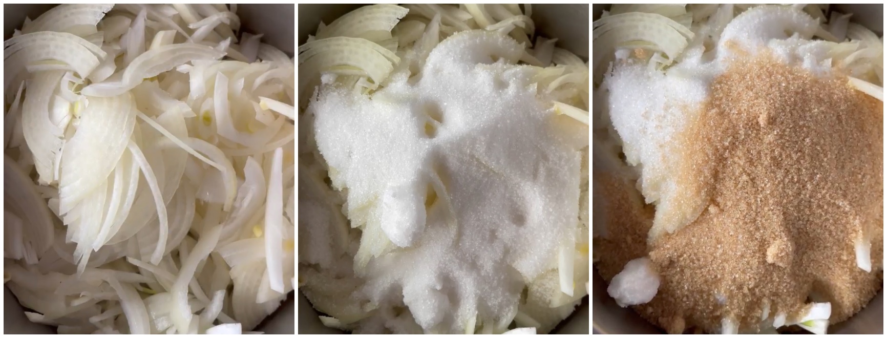 Mettete le cipolle in una pentola con lo zucchero di canna e lo zucchero semolato.