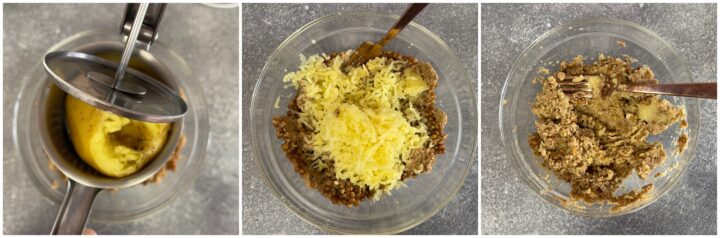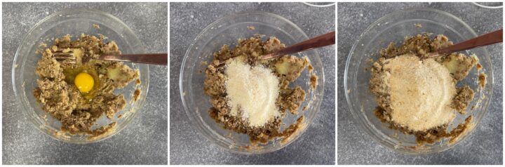 Quando patate e lenticchie saranno amalgamati aggiungete un uovo intero, il parmigiano grattugiato e il pangrattato.