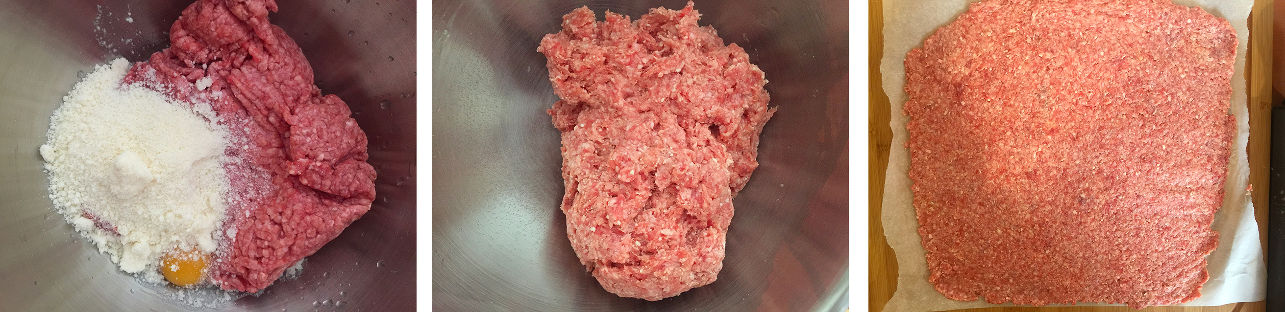 Stendete l’impasto di carne macinata su un foglio con carta forno e create un rettangolo.