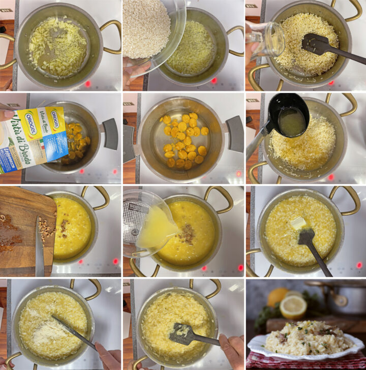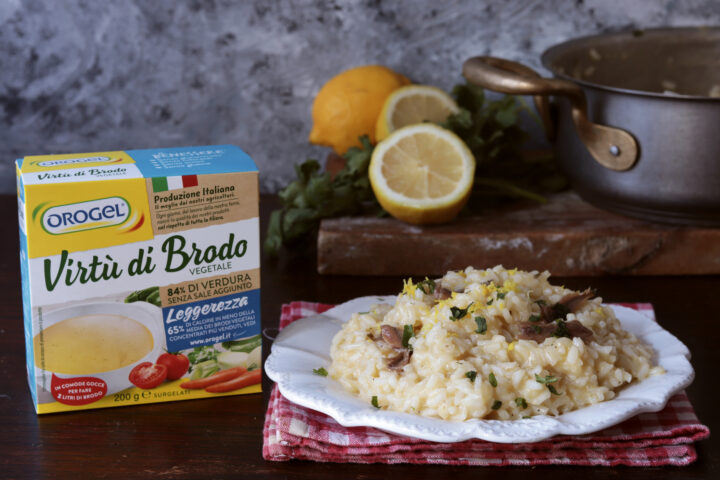 Risotto acciughe e limone un primo piatto cremosissimo, facile da preparare, che fa un sacco di scena ma anche molto economico (che non guasta no?) perchè gli ingredienti sono davvero semplicissimi e sono anche nella maggior parte delle vostre dispense ne sono sicura. La settimana scorsa la mia amica Giovanna mi ha portato 4 limoni del suo giardino, che meraviglia e che profumo! Io ho una pianta di limoni ma devo ancora travasarla e piantarla in giardino, meglio che lo faccia fare al giardiniere perchè io, imbranata come sono, rischio sicuramente di farla morire. Voi avete il pollice verde o siete delle frane come me? In ogni caso, tornando alla ricetta del risotto…sapete che per fare un buon risotto bisogna partire soprattutto da ingredienti genuini? Quindi ecco i limoni naturali e ovviamente il brodo, io per far prima ho usato Virtù di Brodo Vegetale Orogel, preparato solo con verdure e acqua senza aromi, glutammato e anche senza sale quindi posso decidere io quanto salare il mio risotto visto che ci sono anche le acciughe che, come sapete, sono molto sapide. Allora volete preparare insieme a me il risotto limone e acciughe? Iniziamo subito a vedere tutti gli ingredienti e fatemi sapere se vi è piaciuto! Ah… Non perdete le dirette in pagina (QUI) e il mio account Instagram (QUI)