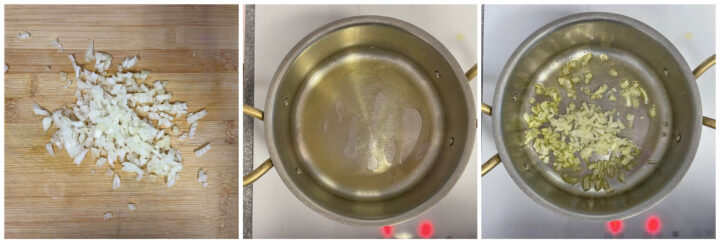 In una casseruola fate scaldare 3 cucchiai di olio extravergine di oliva e mettete a cuocere la cipolla tritata.
