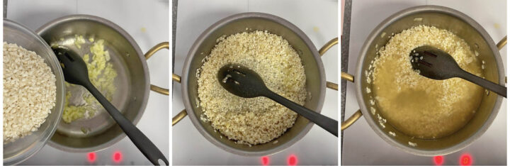 Fate tostare il riso per un paio di minuti mescolando fino a che i chicchi diventeranno trasparenti poi sfumate con il vino bianco e lasciate evaporare.