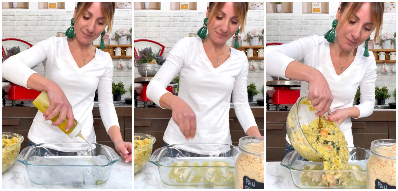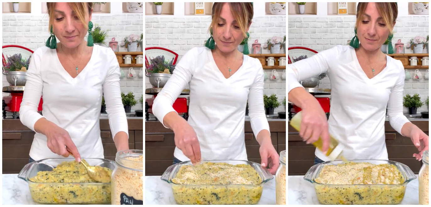 Mettete un pochino di olio sulla base di una pirofila e mettete un po’ di pangrattato. Distribuite tutto il composto per lo sformato di verdure e livellate bene la superficie.