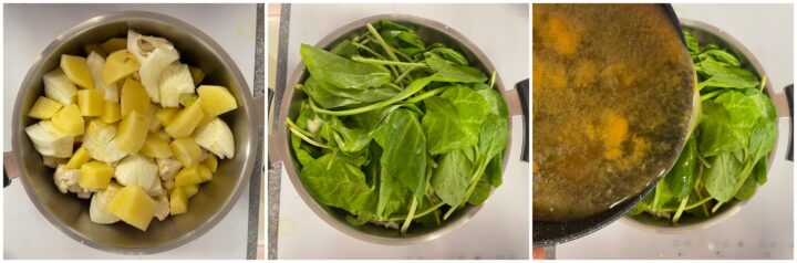 Mettete in una pentola capiente tutte le verdure tagliate poi unite anche le bietole fresche e il brodo vegetale.