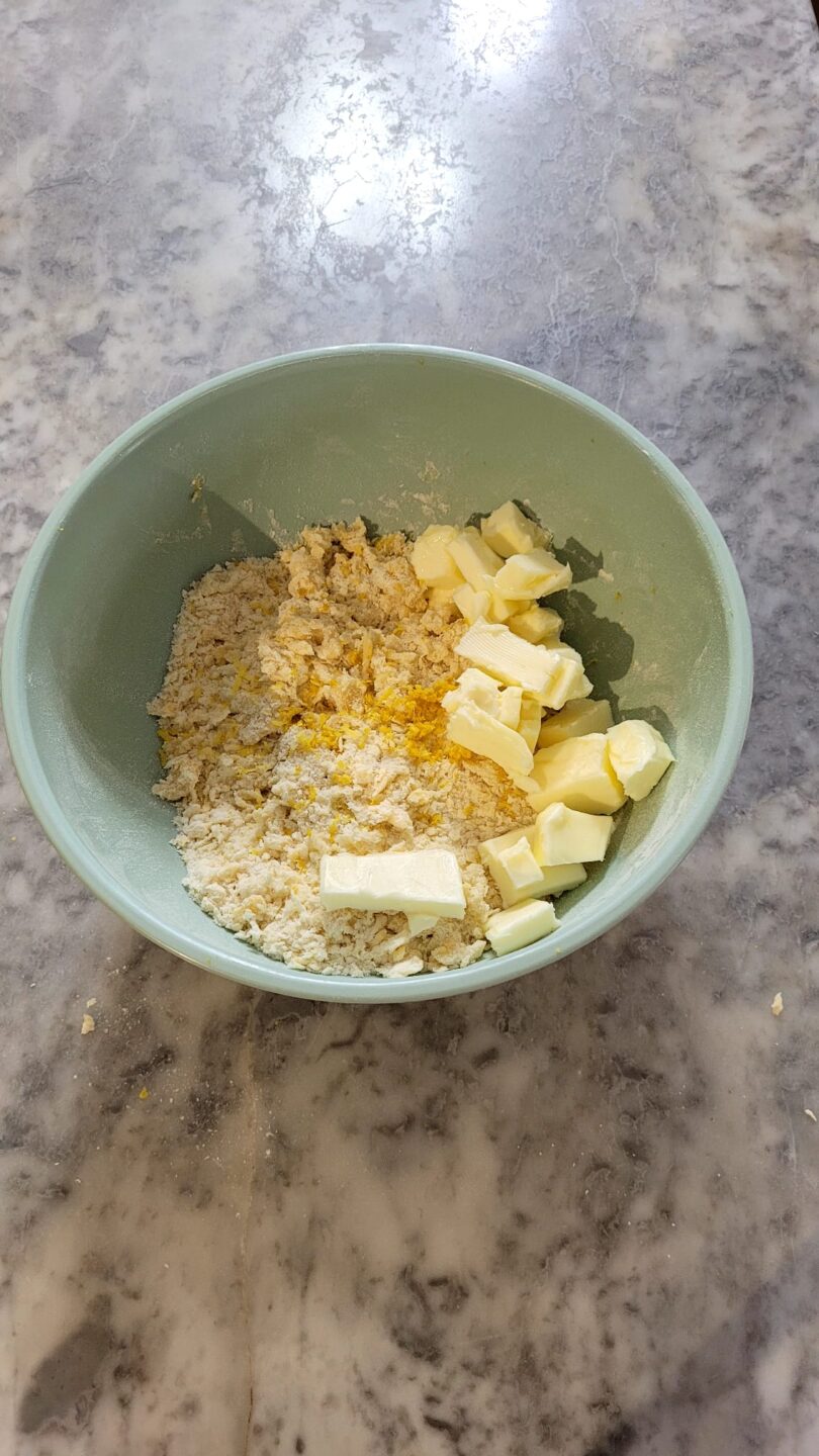 Lavorate con una forchetta gli ingredienti fino ad ottenere un composto sabbioso. Aggiungete la buccia grattugiata di mezzo limone e il burro morbido tagliato a tocchetti. Impastate con le mani velocemente fino ad ottenere un composto liscio e compatto