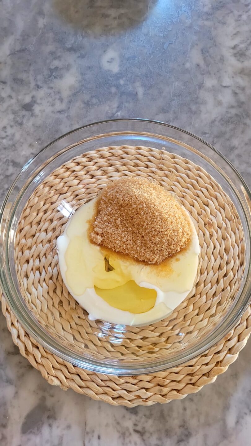 In un’altra ciotola versate gli ingredienti liquidi (yogurt e olio) e lo zucchero.