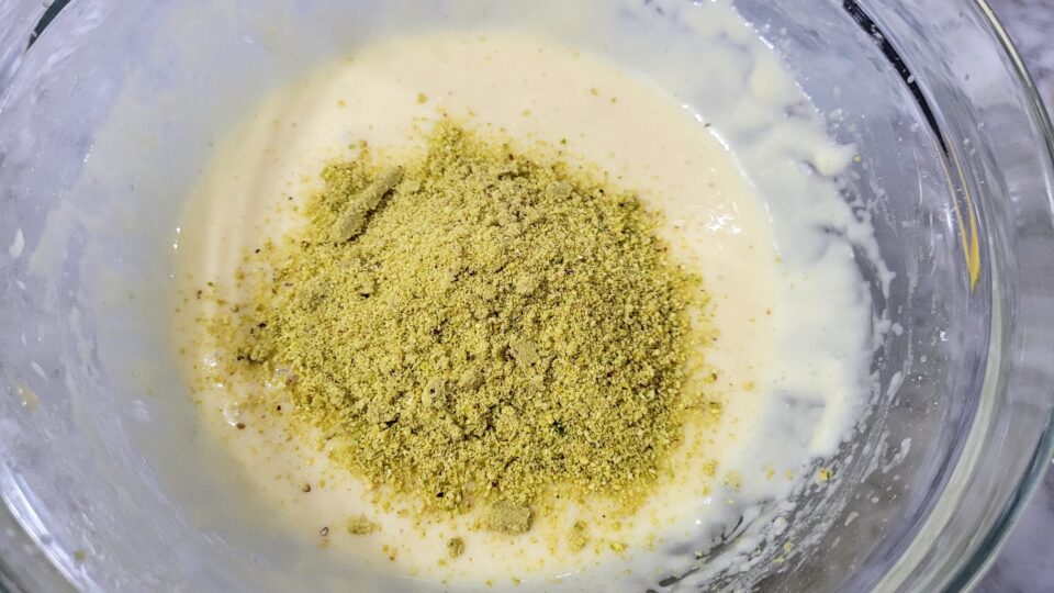 Aggiungete i pistacchi in polvere e mescolate bene