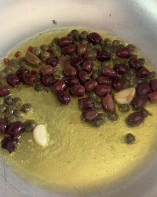 In una padella facciamo imbiondire uno spicchio di aglio in camicia, uniamo le olive e i capperi. Facciamo soffriggere per qualche minuto.