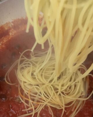 nel frattempo che il sugo cuoce, cuciamo gli spaghetti in acqua bollente salata. Scoliamo gli spaghetti al dente e mantechiamo con qualche mestolo di acqua di cottura e un bel giro di olio gli spaghetti nel sugo.