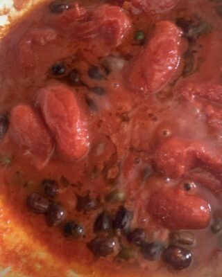 Uniamo al soffritto i pelati e un bel pizzico di sale. Cuociamo lentamente .