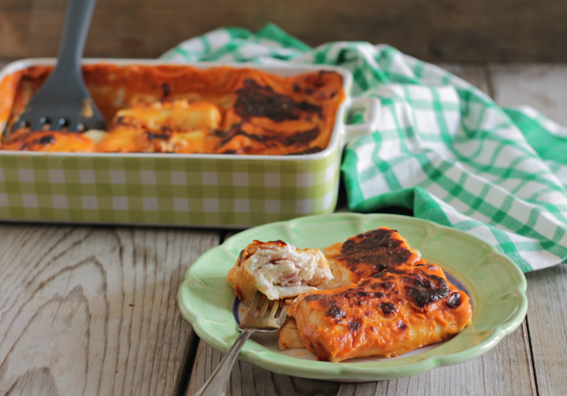 Sfornate e lasciate intiepidire le crespelle al forno con ricotta e prosciutto per 7-8 minuti