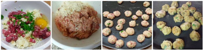 Prelevate 100 gr. di carne tritata unite al panino ammollato e strizzato, aggiungete l’uovo, un pò di grana, il sale l’aglio e il prezzemolo tritato. Impastate bene poi formate piccole palline passate in una teglia con carta forno unta di olio e passate in forno caldo 200° fino a quando non risultano dorate,.