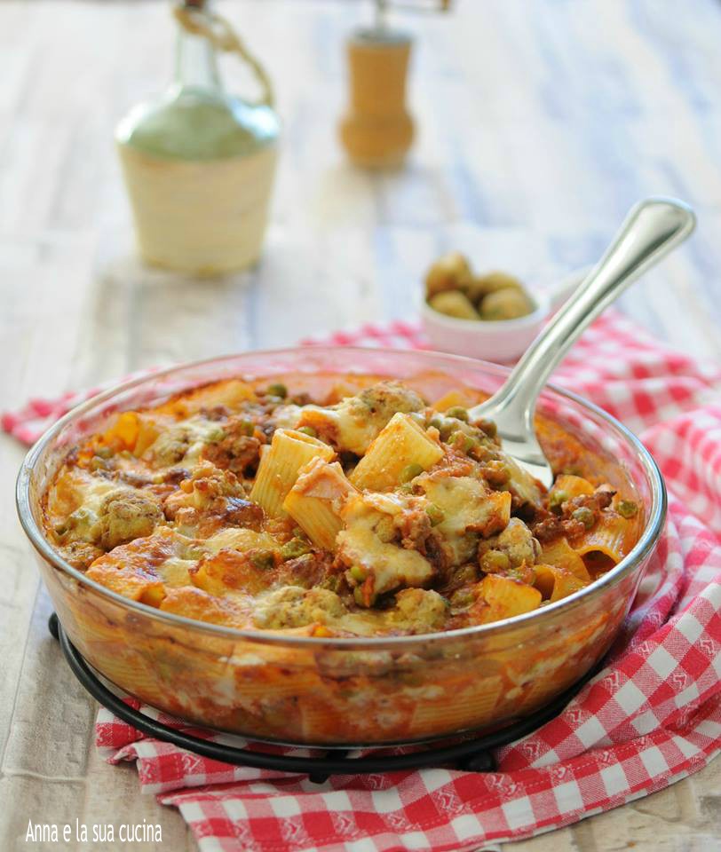 Rigatoni al forno con ragù, piselli e polpettine