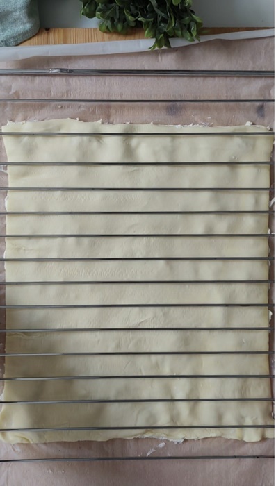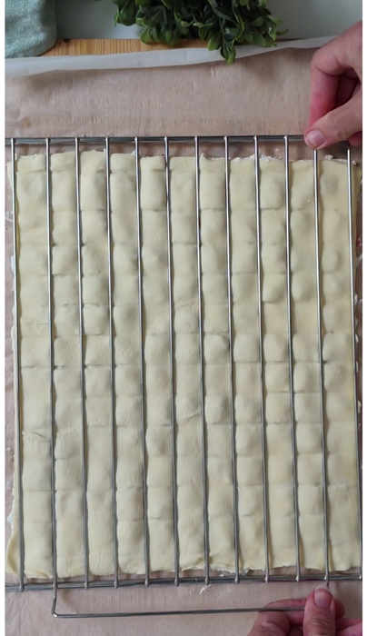 Ora prendete la griglia del forno e pressatela sulla sfoglia in modo da creare delle righe, non dovete tagliare la sfoglia ma creare delle righe in superficie.
