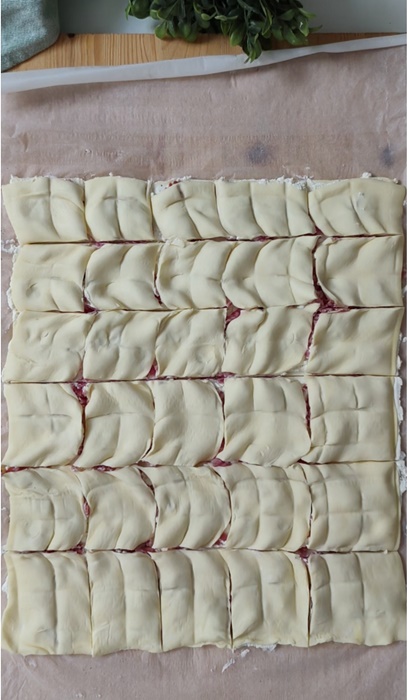 Con un coltello affilato tagliate 6 righe verticali lungo tutta la sfoglia (dovete tagliare anche ultima sfoglia, dovrete separare le strisce).