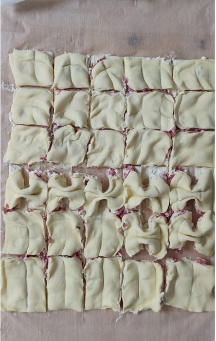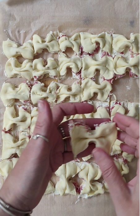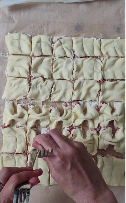 Ora con l’aiuto dell’impugnatura di 2 forchette o cucchiai unite il centro del quadratino,, trascinandolo verso il centro e pressate leggermente in modo da ottenere dei fiocchi come in foto (dal video sopra sarà più chiaro, è più semplice da fare, che da spiegare).