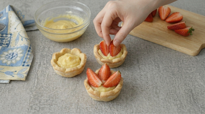 Adagiate gli spicchi di fragola sopra la crema, premendo leggermente per stabilizzarli.
