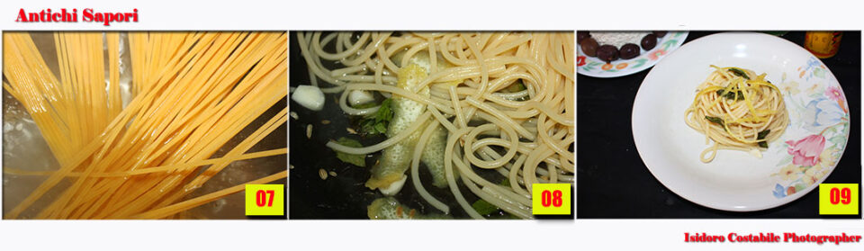 Calo la pasta visto che l’acqua bolle (07). Cotta la pasta la scoleremo e la uniremo nella padella mantecando a freddo il tutto (08). Servo con delle striscioline di limone o se volete grattugiate la buccia (09).