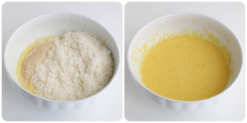 Aggiungete il pangrattato, il parmigiano, il sale e il pepe e sbattete ancora fino a mescolare bene il tutto.