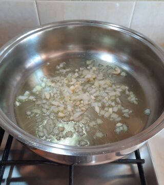 In una padella capiente scaldare un filo d’olio e far imbiondire dolcemente l’aglio e la cipolla tritata.