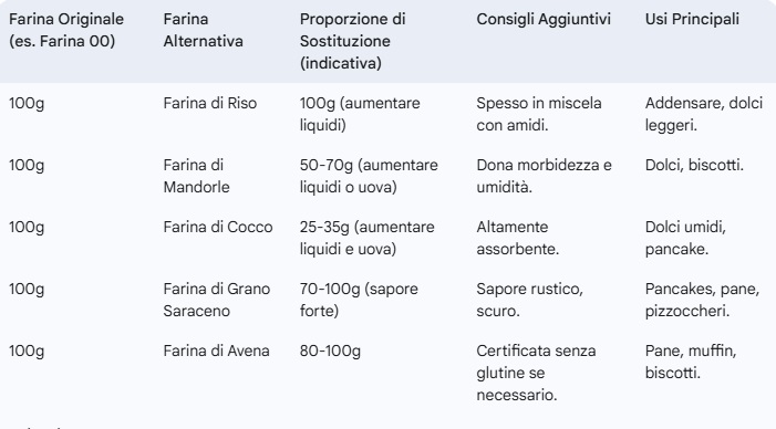 - Sostituzioni Parziali: Se hai paura di stravolgere una ricetta, prova a sostituire solo una parte della farina (es. 25-50%) con l’alternativa scelta.