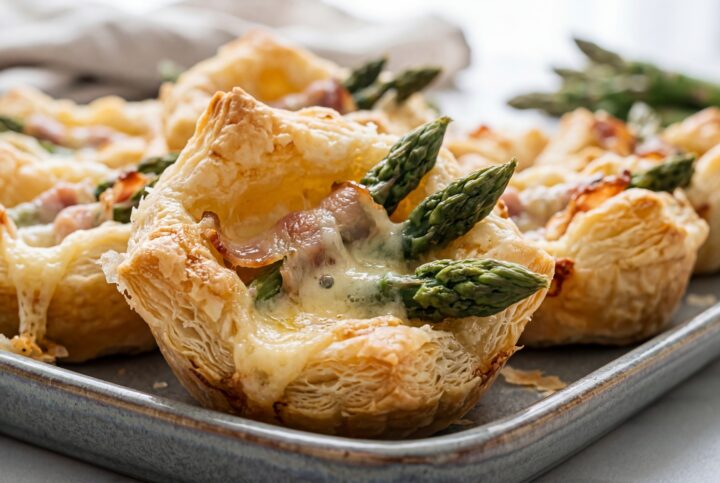 Cestini di pasta sfoglia ripieni di asparagi saltati, bacon croccante e provola affumicata