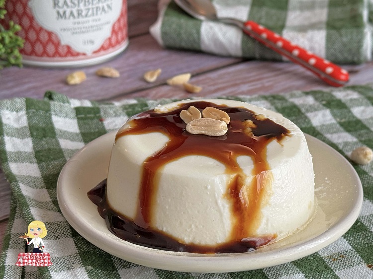 Per la mia panna cotta ho scelto una guarnizione semplice fatta di caramello e qualche arachide tostata ma puoi arricchirla anche con marmellata di fragole e fragole fresche, oppure una composta di frutti di bosco o cioccolato fondente fuso.