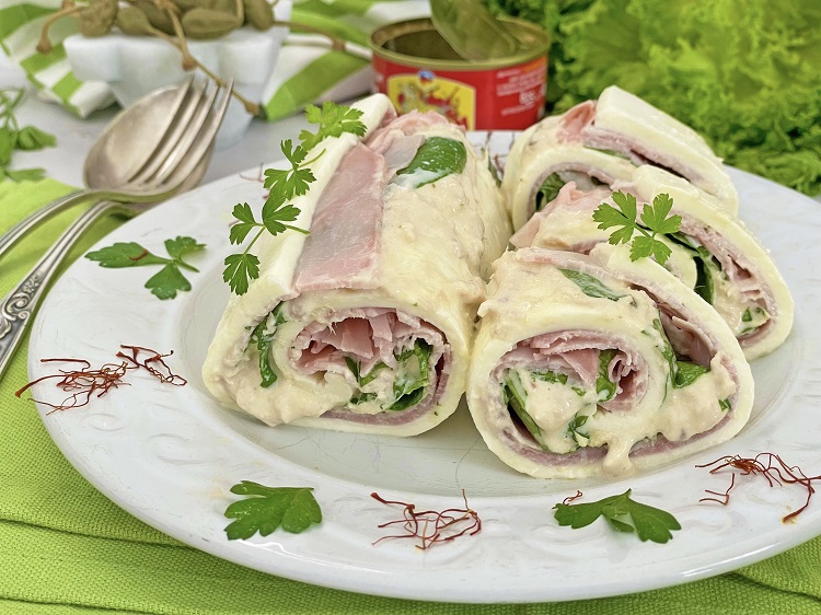 Questa preparazione però si presta a molte varianti: potete farcire il rotolo di mozzarella con patè di olive e speck oppure con prosciutto cotto e verdure grigliate come zucchine e peperoni o ancora con rucola e prosciutto crudo, con prosciutto crudo e funghi saltati, con frittata, formaggio spalmabile e bresaola … Ecco perchè dico che si tratta di una vera e propria ricetta jolly da personalizzare a piacere.