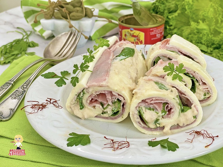 Oggi, tra le tante varianti possibili, farciremo la Sfoglia di Mozzarella con il mio “ripieno” preferito: Salsa Tonnata, prosciutto cotto e lattuga, un grande classico che proprio per questo riscuote sempre successo.