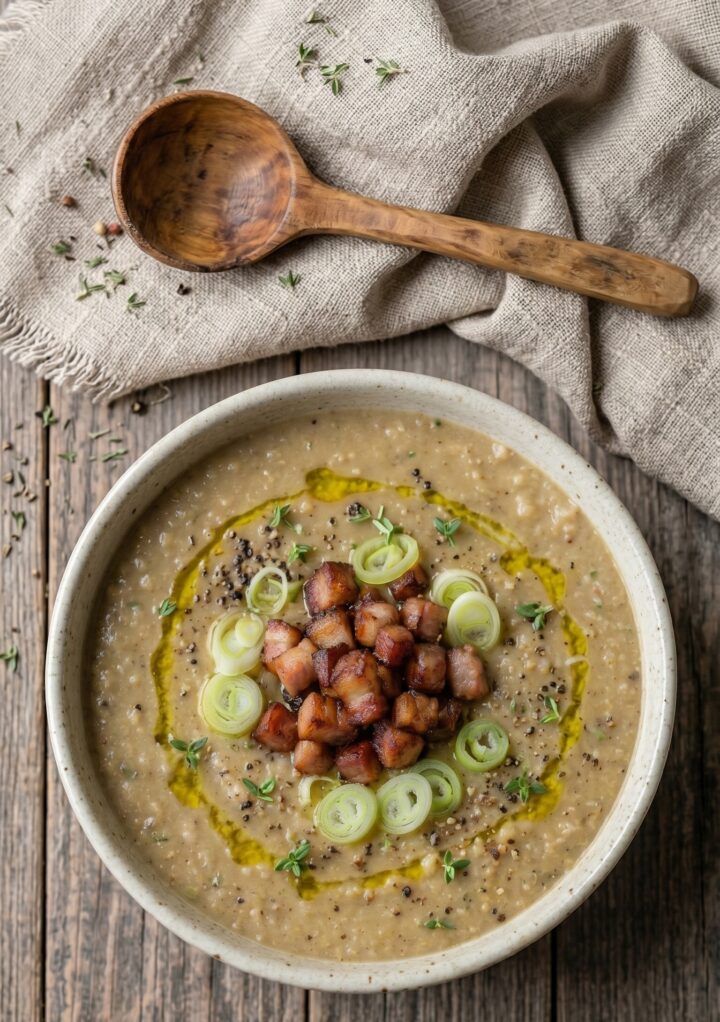 Per risolvere questo problema lavoreremo la zuppa con un frullatore ad immersione e daremo una spinta la pancetta — che prima insaporisce la base e poi torna come guarnizione croccante — crea un contrasto tattile fondamentale: la cremosità vellutata della zuppa accoglie il “crunch” della pancetta dorata, eliminando la monotonia della consistenza tipica dei passati di verdura.