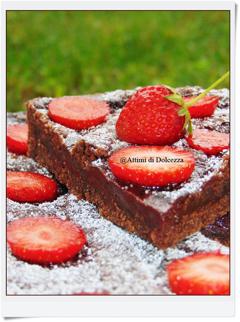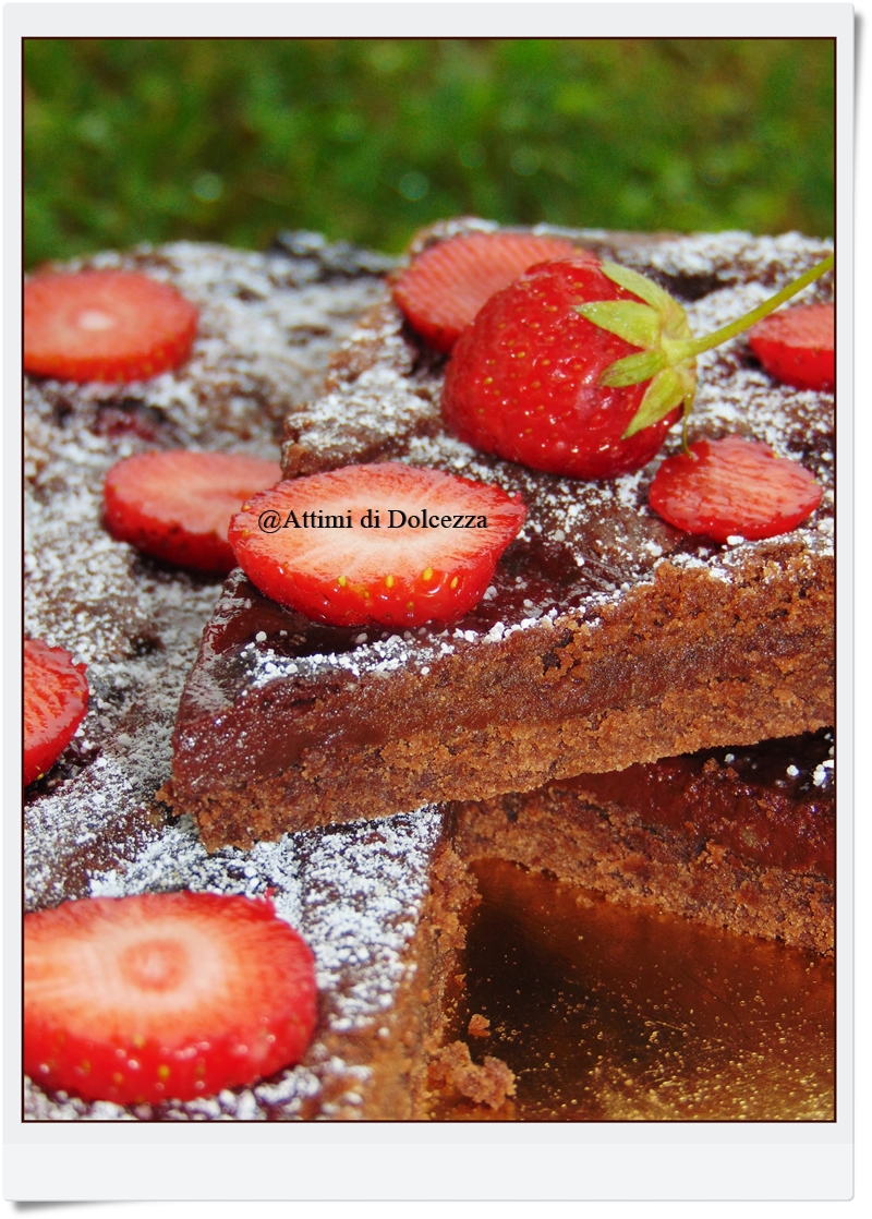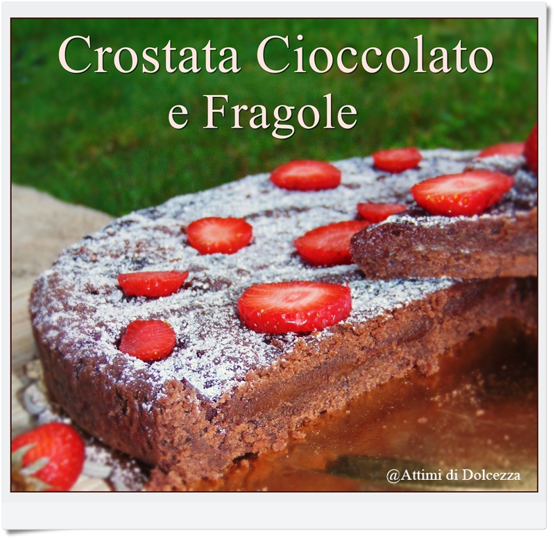 farcite con la crema al cioccolato e livellate uniformemente con il cucchiaio,abbassate i bordi di frolla verso l’interno e sistemate le fragole macerate in superficie qua e la,poi terminate con delle strisce di pasta frolla rimanente negli spazi vuoti.