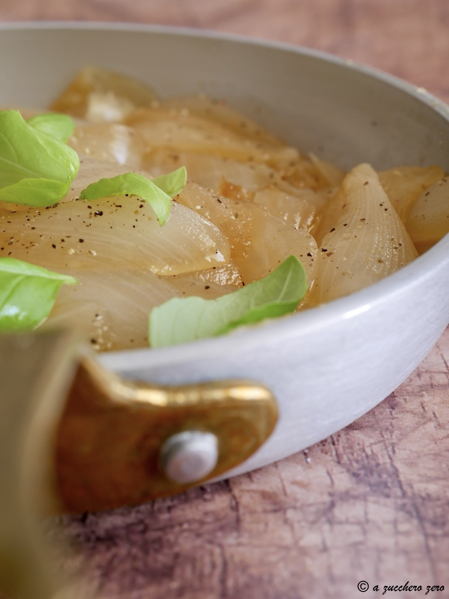Naturalmente prepariamo le cipolle caramellate senza zucchero e senza olio [che aggiungo a preparazione ultimata, rigorosamente a crudo] con sale, aceto e dolcificante e acqua.