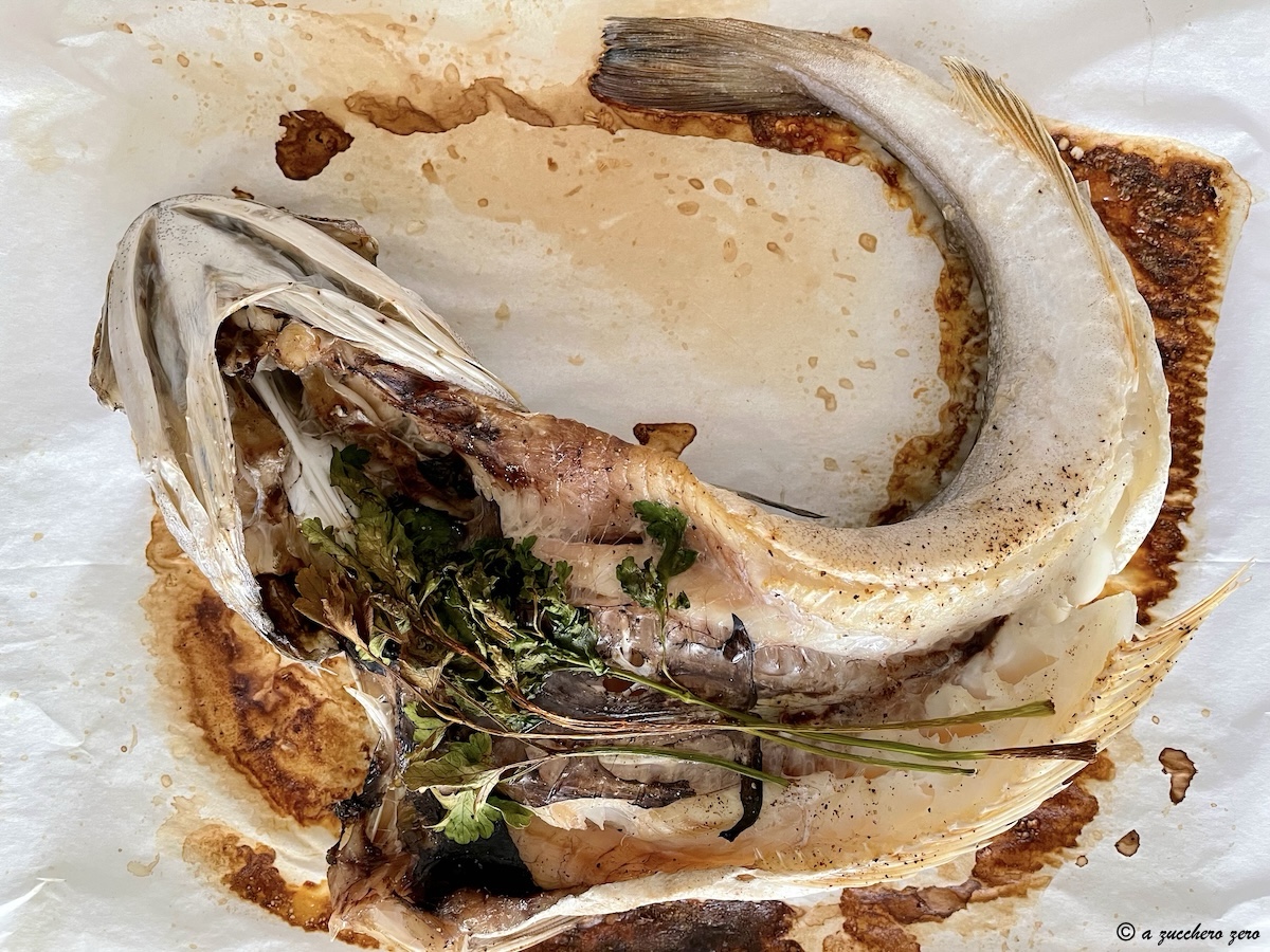 Il merluzzo è cotto quando la forchetta entra ed esce facilmente dai filetti e i filetti si sfaldano facilmente. Osserva il colore delle carni e che gli occhi siano diventati bianchi e opachi.