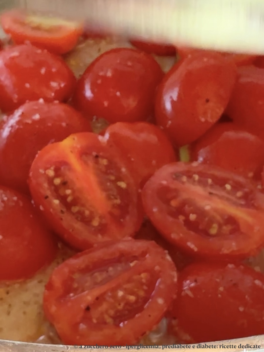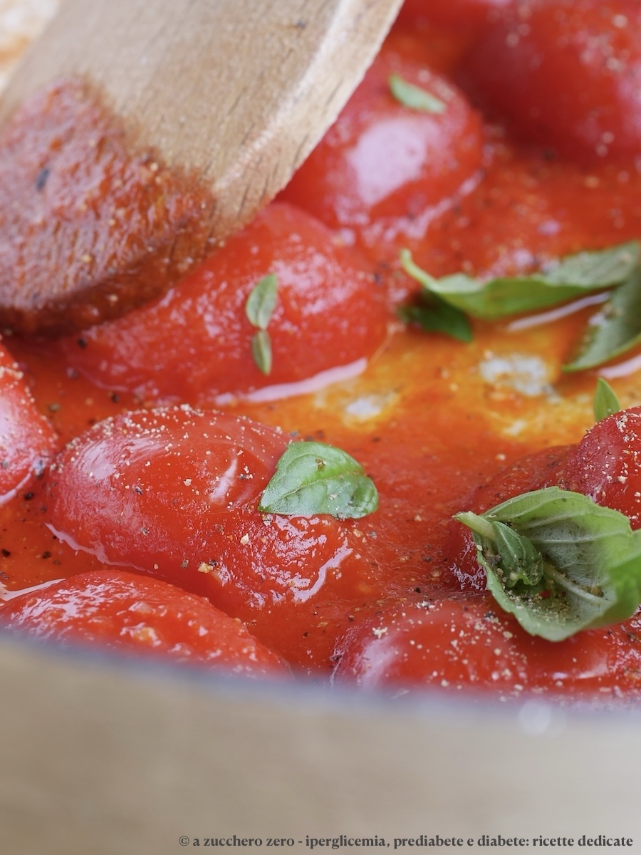 È il condimento dell’estate: dolcezza naturale dei pomodorini senza aggiunta di zucchero e senza utilizzo di olio in cottura a misura di iperglicemia, prediabete e diabete di tipo 2 e profumo di basilico.