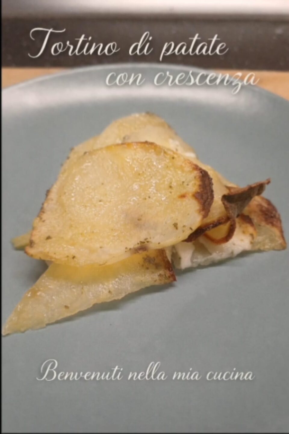 In una teglia da 24 cm formare uno strato di patate, poi distribuire la crescenza a tocchetti e coprire con un altro strato di fettine di patate.