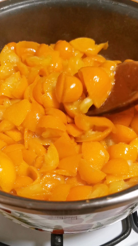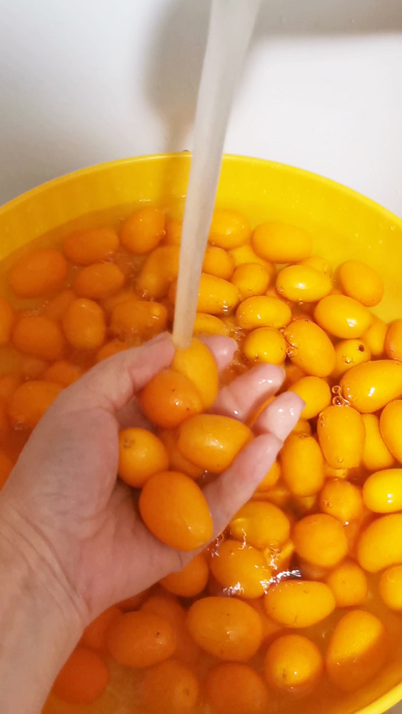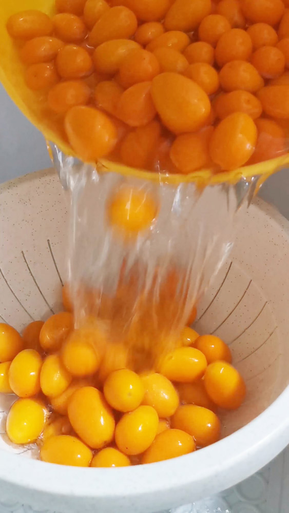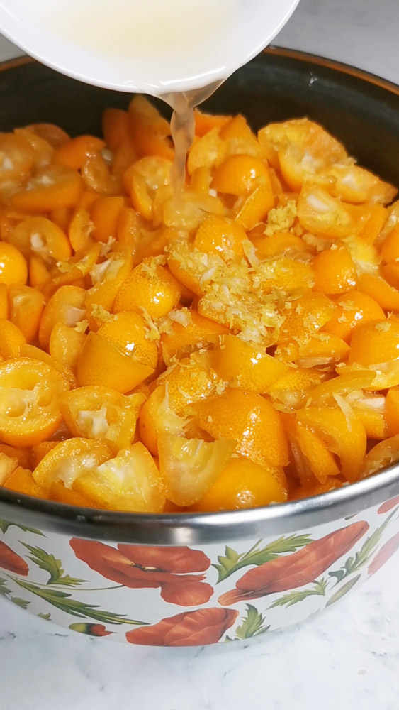 Lavate i mandarini cinesi e lasciateli in ammollo nell’acqua fredda almeno per 6 ore, questo farà in modo che la buccia venga reidratata e ammorbidisca. Dopodiché tagliateli a metà, o se preferite a rondelle e togliete tutti i semini.