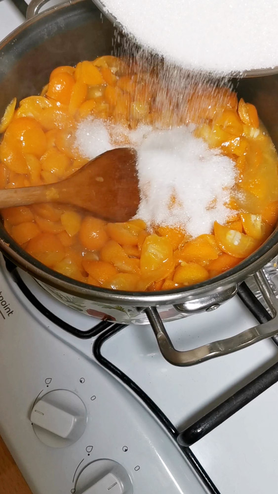 Aggiungete lo zucchero a piccoli dosi sempre mescolando, ora proseguite la cottura e fate sciogliere completamente lo zucchero. Di solito ci vogliono 30 minuti, ma regolatevi da voi, quando il composto inizierà ad addensare. Dopodiché se preferite una consistenza più vellutata, frullate la marmellata con un frullatore ad immersione.