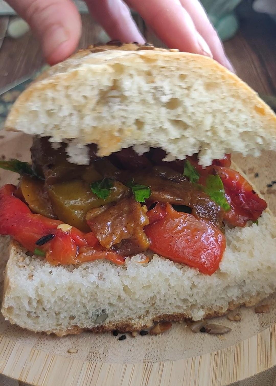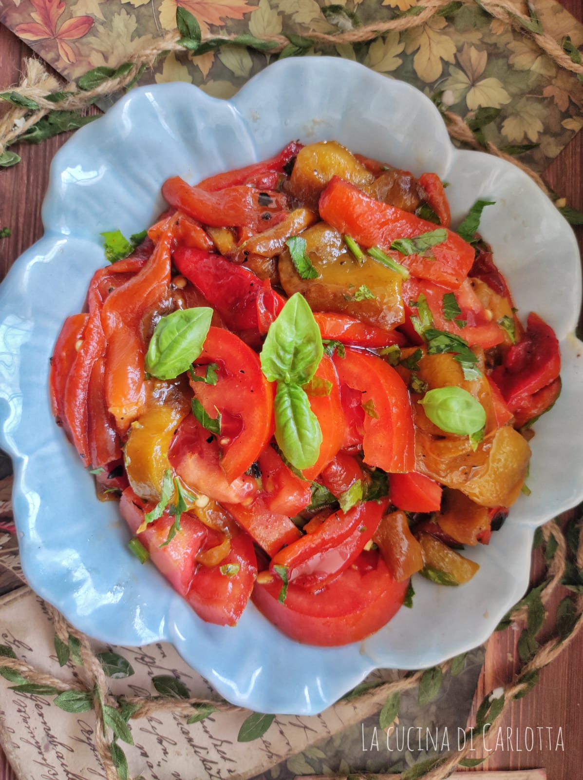 Un altro modo per servire i peperoni arrostiti e che ho sempre visto fare a casa mia, è con i pomodori e tanto basilico Soprattutto in estate, serviti sulla tipica fresa calabrese.