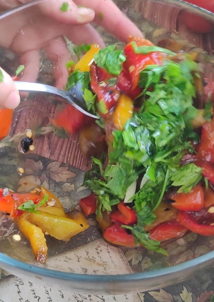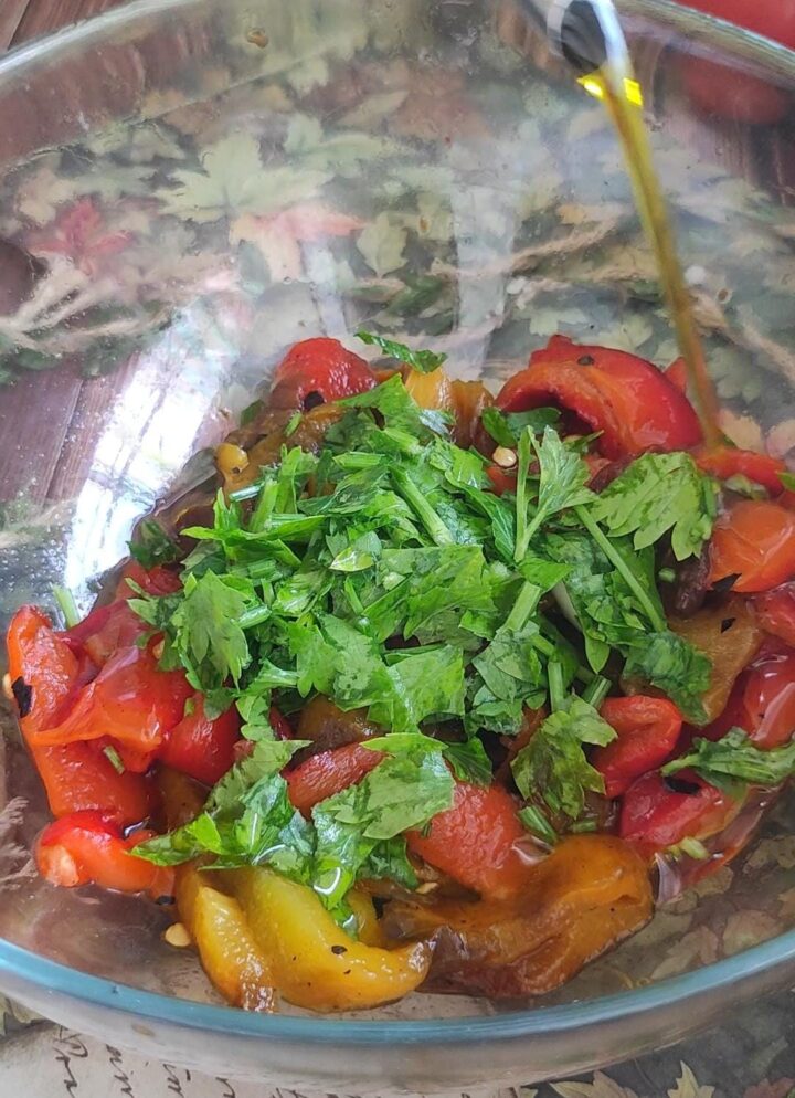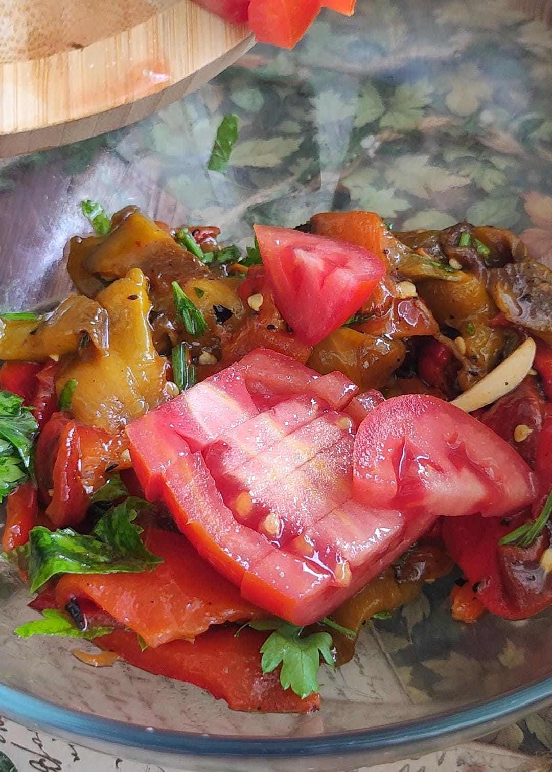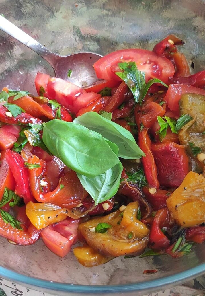 Basta semplicemente aggiungere dei pomodori da insalata, ai peperoni arrostiti e tanto basilico. Sarà un’insalata gustosa e perfetta per le cene estive