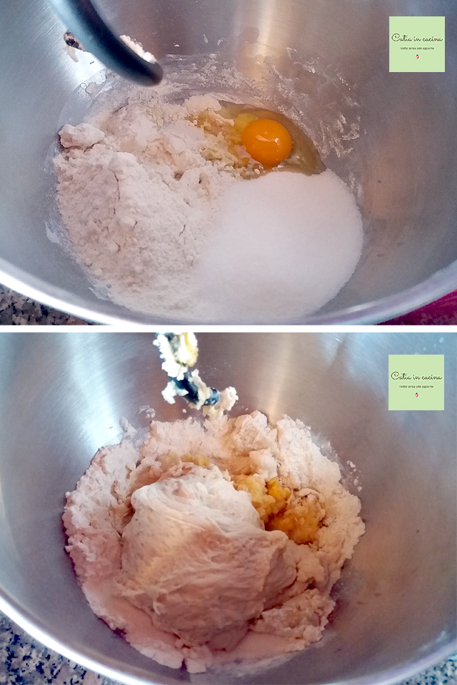 Io ho impastato tutto con la planetaria ma si può fare anche sul piano di lavoro, se si intende impastare a mano. Il composto è morbido e un po’ appiccicoso ma si riesce a gestire anche a mano.